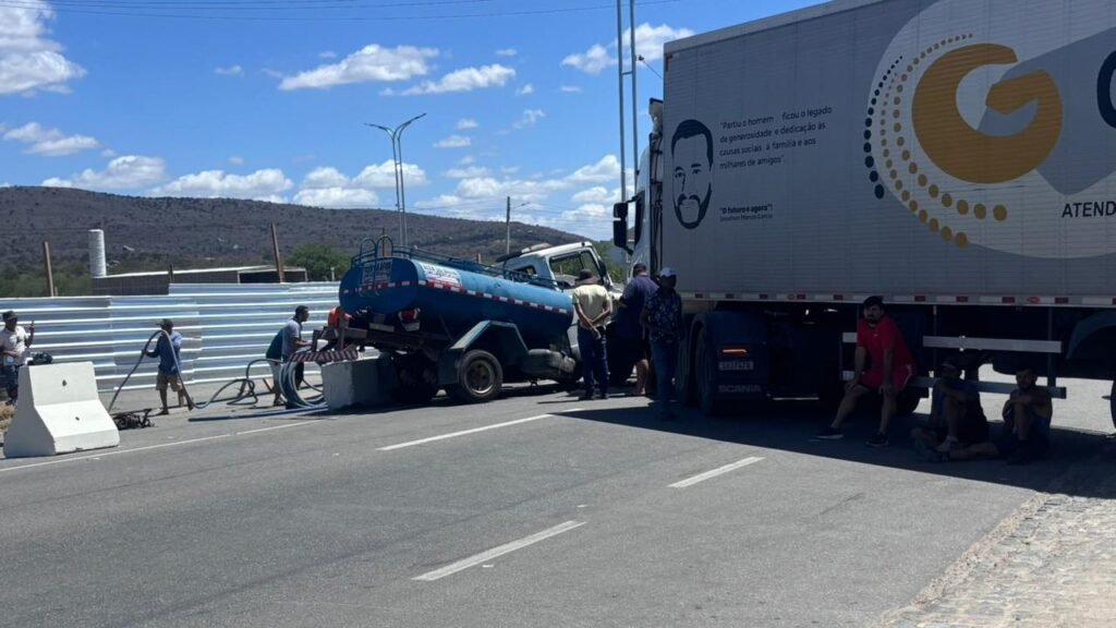 De acordo com informações de testemunhas, o acidente envolveu uma carreta carregada de tecidos e um caminhão que transportava água. Com o impacto, parte da carga líquida se espalhou pela pista e o caminhão ficou danificado.