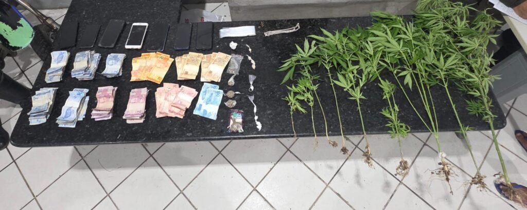 Durante a vistoria, foram encontrados oito pés de cannabis, além de porções de maconha, crack e cocaína. Também foram apreendidos dinheiro em espécie, aparelhos celulares e um cordão.