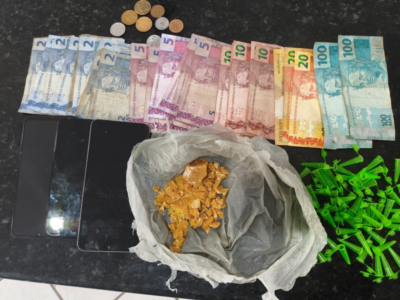 Dentro da bolsa, osGCMs encontraram três aparelhos celulares, a quantia de R$ 422,85 em dinheiro, além de cerca de 50 gramas de substância semelhante ao crack e pinos utilizados para o acondicionamento de entorpecentes.