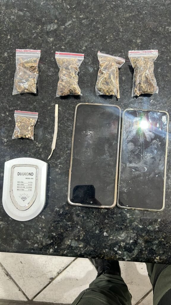 De acordo com as informações, o efetivo realizava rondas quando se aproximou de duas pessoas em atitude suspeita. Durante a abordagem, com um dos indivíduos foi encontrado um cigarro de maconha, enquanto o outro suspeito se evadiu do local, deixando para trás algumas porções de maconha prontas para a venda, além de uma balança de precisão.
